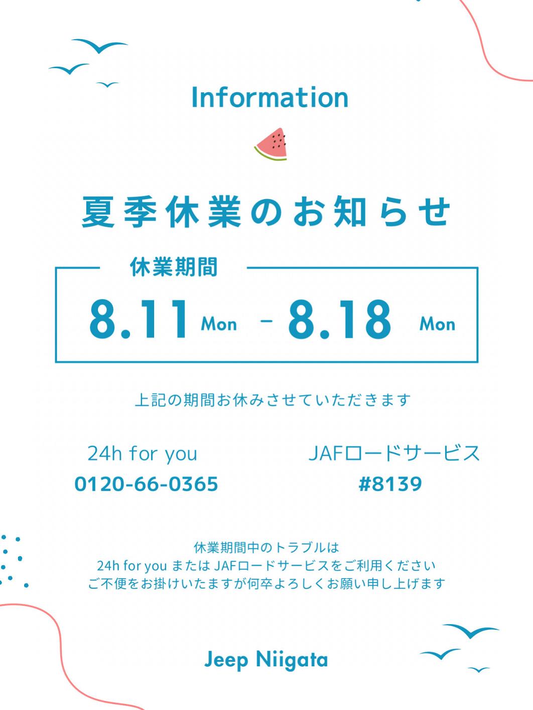 夏季休業のお知らせです。
